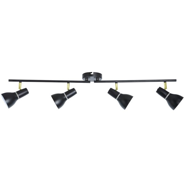 Tobago spotrekke med justerbare armer er en meget anvendelig lampe med 4 retningsstyrte lys, og er beregnet til bruk i tak. De justerbare spothodene gjør det enkelt å justere lyset dit det trengs og spothodene har en dekorativ lysring. Denne lampen blir solgt uten lyspærer så du selv kan velge etter behov.