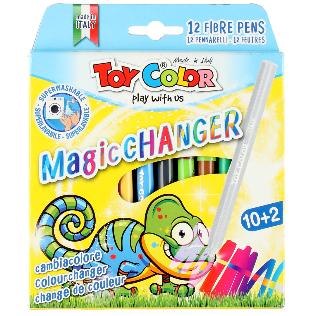 10 stk fargepenner og 2 stk magiske penner. Ved å male over standarfargenemed de magiske pennene forandres fargen helt. Det er også mulig å skrivehe mmelige beskjeder med de magiske pennene og få beskjeden til å viseseg med å skrive over med de vanlige fargepennene.