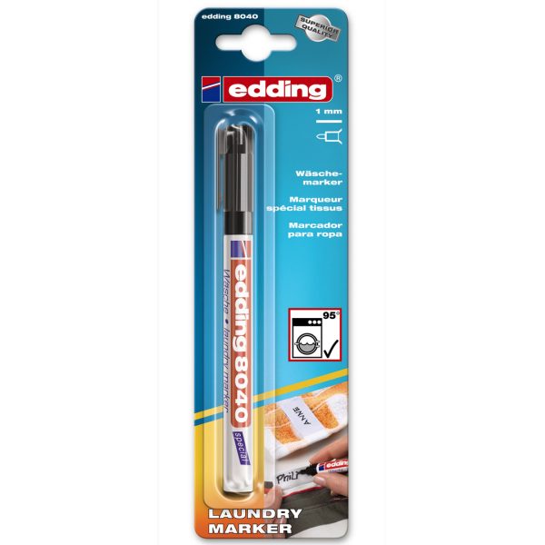 Edding 8040 Laundry Marker er vannfast og vaskebestandig og kan skrive på nesten alle tekstiler opp til 95 C. Denne permanente tøymerkepennen er spesialformet for skriving på ubehandlede tekstiler som bomull, silke, lin med mer. Merkepennen passer perfekt til å merke klesplagg eller til å tegne på t-skjorter når man vil lage sitt eget mønster.