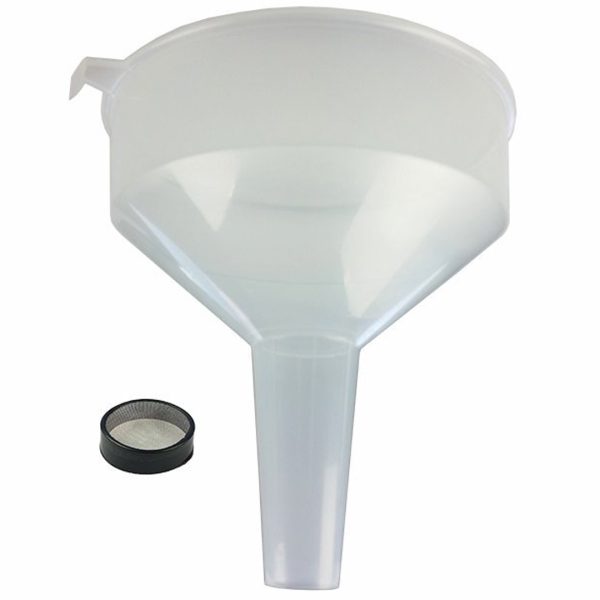 Stor trakt med diameter 20 cm og integrert sil. Ideell til overføring av olje, drivstoff eller andre væsker uten søl. Passer godt til bil, båt og verksted.