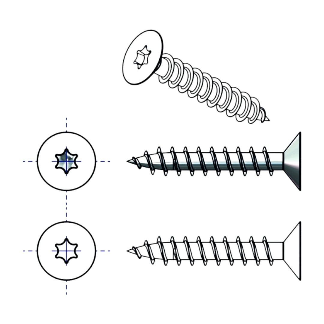 For montering innendørs. Undersiden av hodet er turbinformet, noe som gir en uslåelig forsenkning og en perfekt finish. Superkvass spiss som griper direkte i treet, og patenterte, sagtannede gjenger for utmerket reduksjon av sprekker.