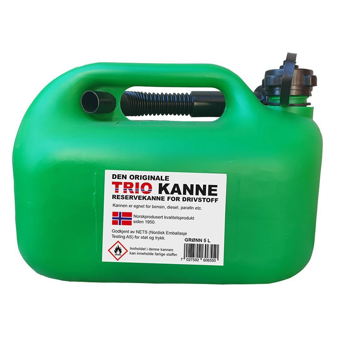 Norskprodusert drivstoffkanne. Testet og godkjent av NETS (Nordisk Emballasje Testing AS) for støt og trykk. Luftig i bakkant som gjør påfylling fra kanne raskere. Helletut og pakning i korken for å unngå lekkasje. Kannen er egnet for bensin, diesel, parafin mm. Volum 5 liter.