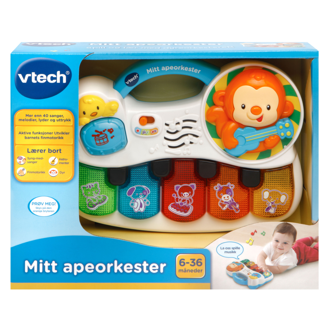Utforsk musikkens verden med Vtech Baby Mitt Apeorkester! Med 40 morsomme sanger, lydeffekter og fraser på norsk, vil denne interaktive leken glede små barn. Perfekt for å stimulere sanser, motorikk og tidlig læring gjennom musikk og lyder. Enkel å bruke og ta med seg på farten.