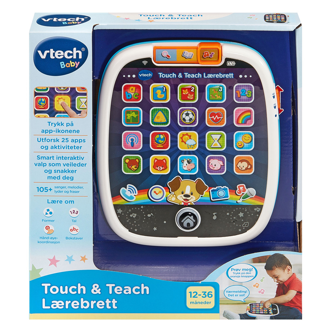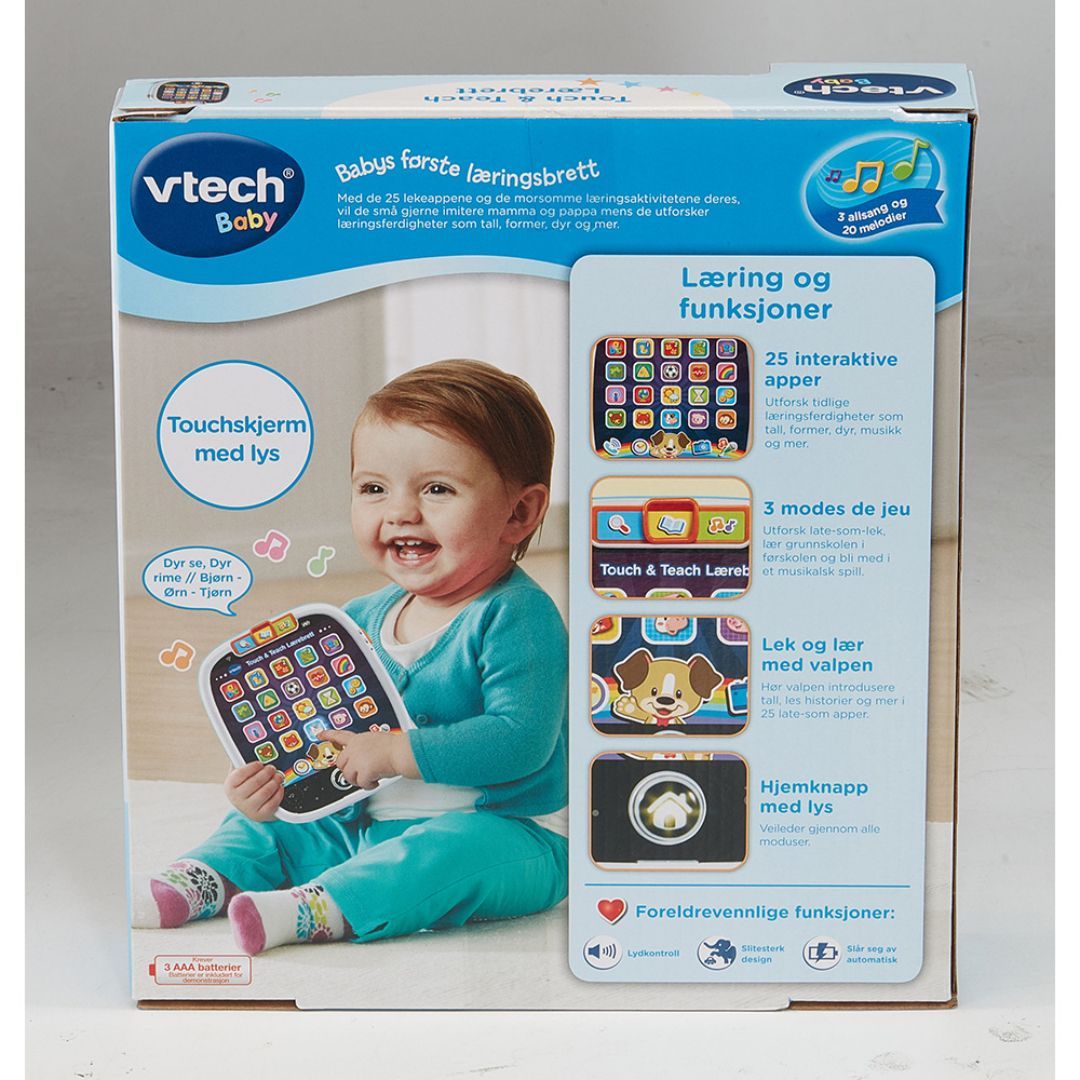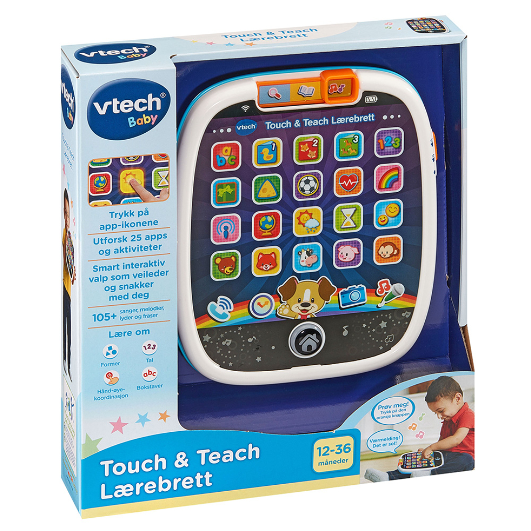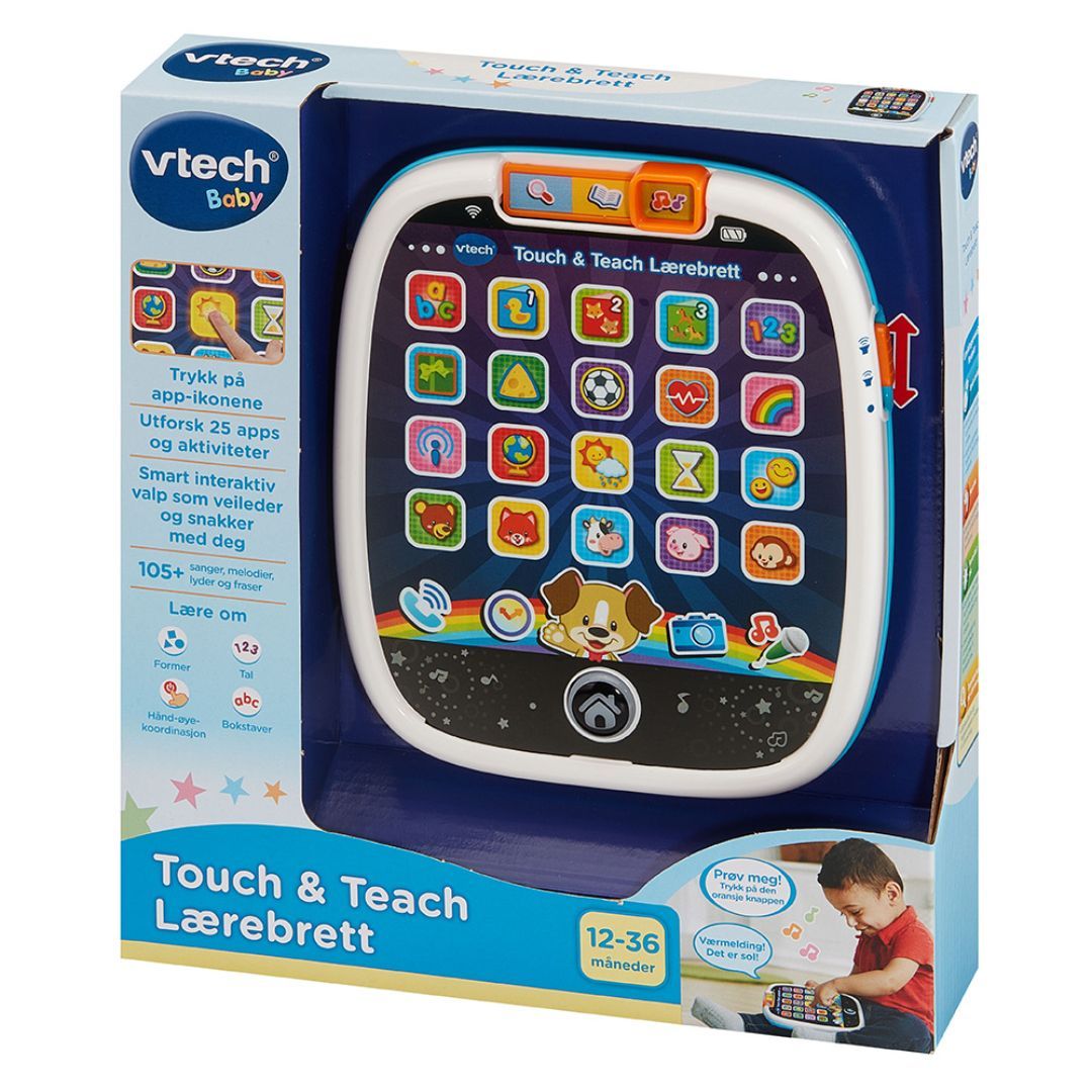 Interaktivt lærebrett på norsk med 25 trykknapper og over 100 lyder og fraser. Introduserer bokstaver, ord, dyr m.m., og har moduser for utforskning, musikk og læring.