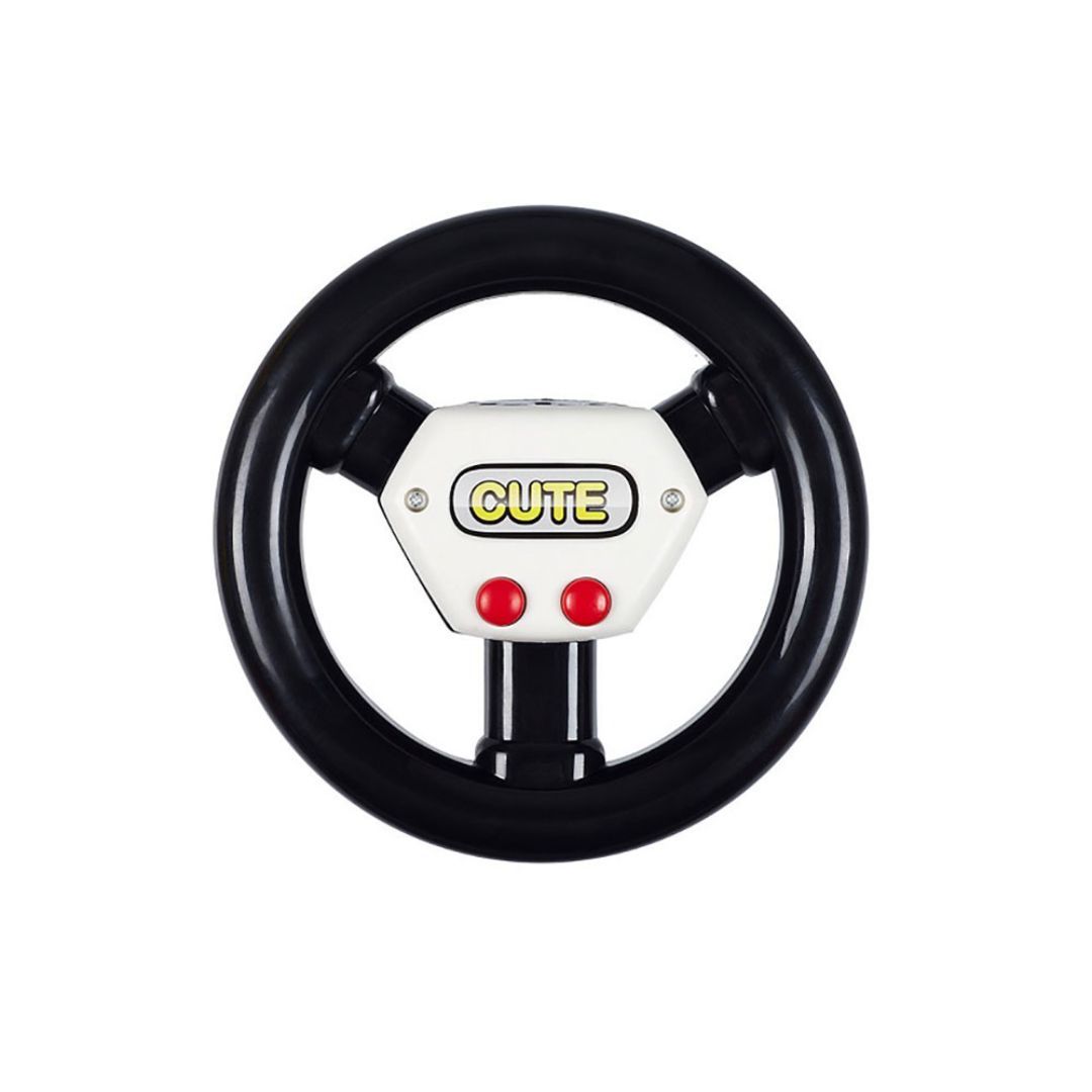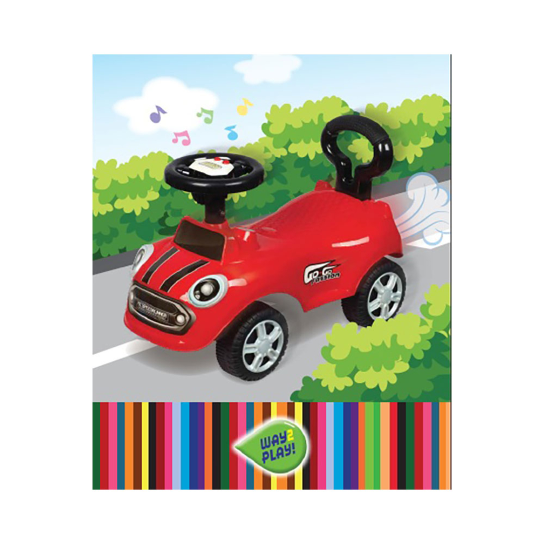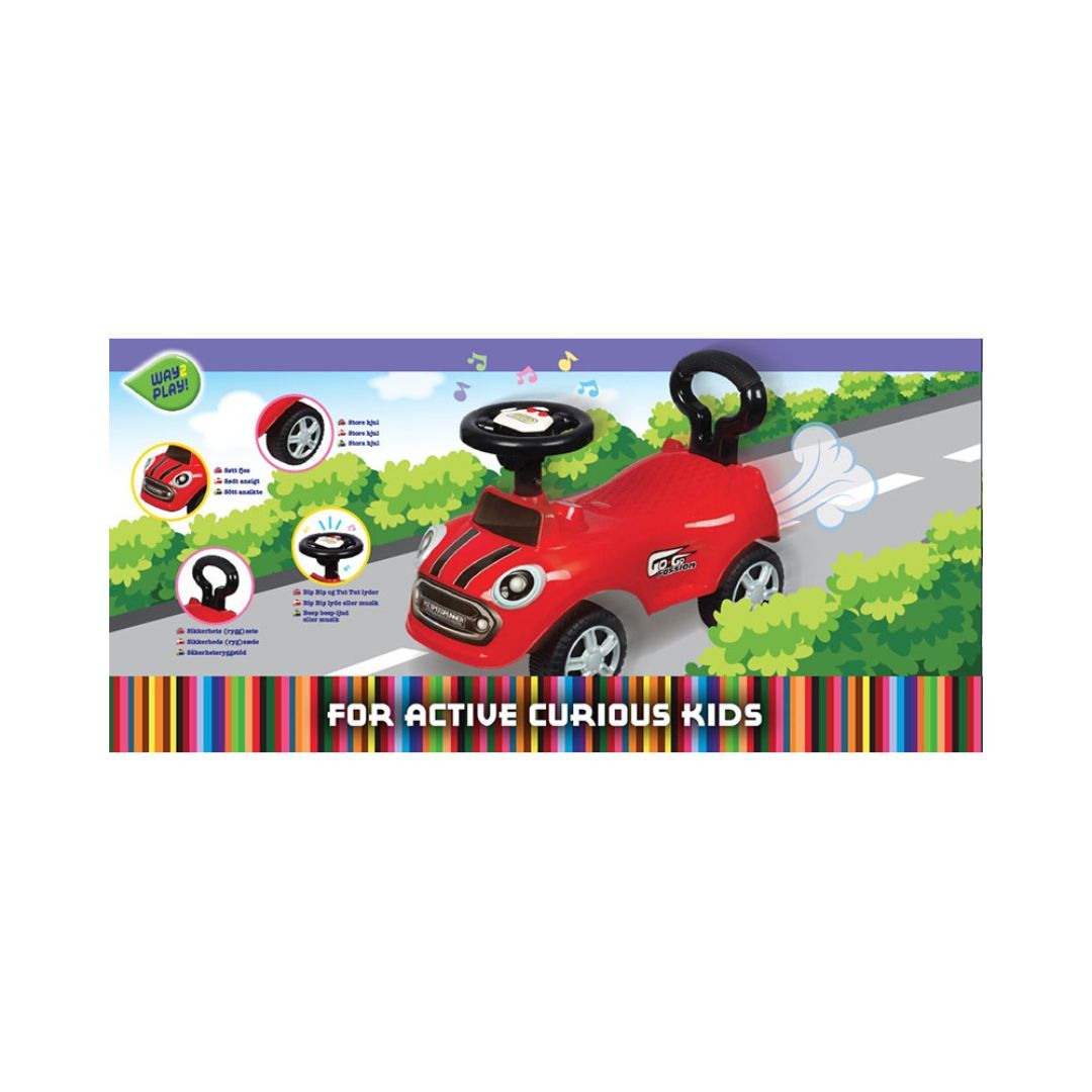 Rød gåbil med musikk, ratt og håndtak bak slik at voksne kan hjelpe til – en morsom og trygg måte for små å utforske sitt miljø.