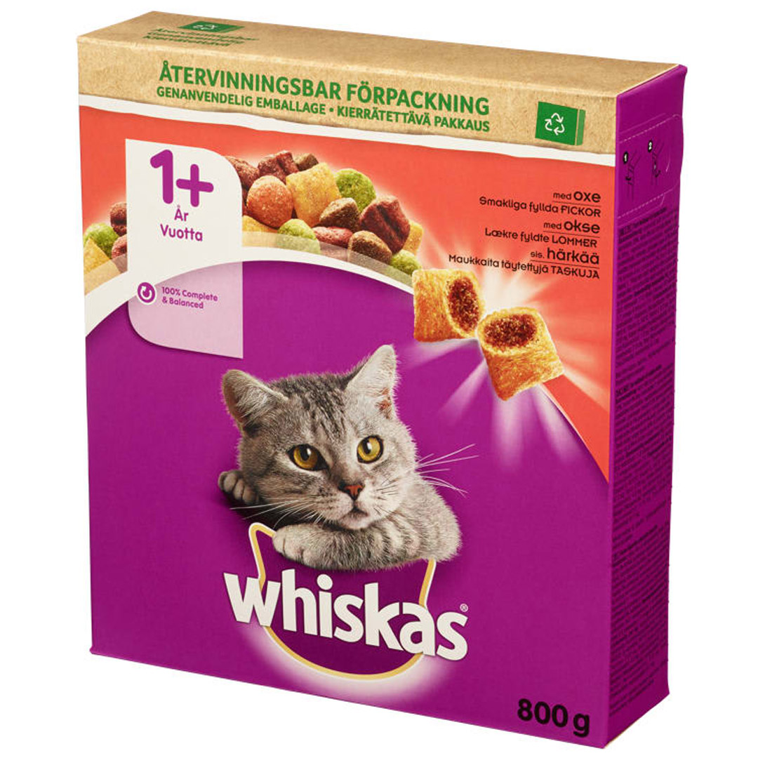 Whiskas 1+ OKSEKJØTT består av lekre fylte biter med næringen katten din trenger for et langt og lykkelig liv.