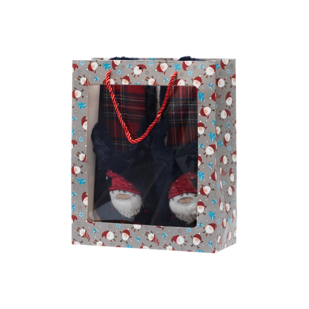 Varme jule-tøfler levert i gavepose med oppheng. Finnes i blå og røde varianter og passer som praktisk gave i vintersesongen.