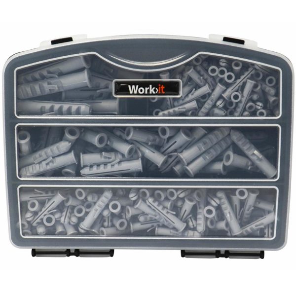 Praktisk sortimentkasse med 230 stk. assorterte nylonplugger med krage. Til bruk i betong eller massiv murstein.