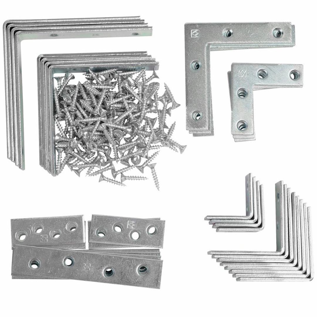 Gjør-det-selv-sortiment med vinkel- og møbelbeslag til hjemmet. Settet inneholder: