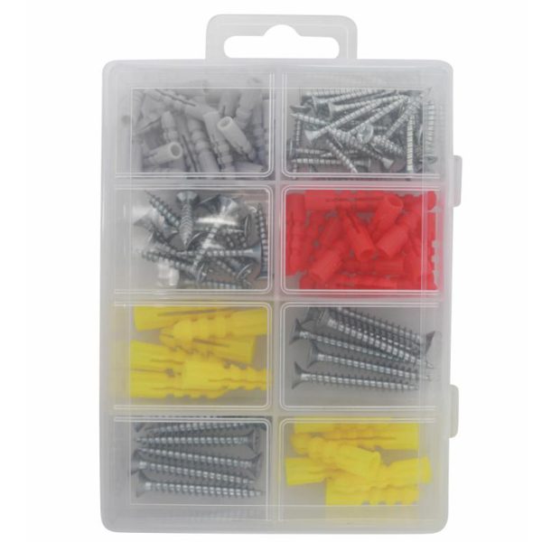 Plugger: #5: 25 stk. #6: 15 stk. #8: 12 stk. Skruer: 3,5×25 mm: 25 stk. 4×25 mm: 15 stk. 5×40 mm: 12 stk.