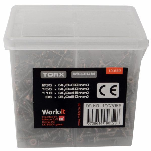 TORX sponplateskruer i praktisk boks, som inneholder:
